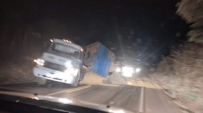 Segundo informações uma carreta que transportava perdeu força em uma subida e acabou descendo de ré, tombando e derrubando a carga na rodovia.