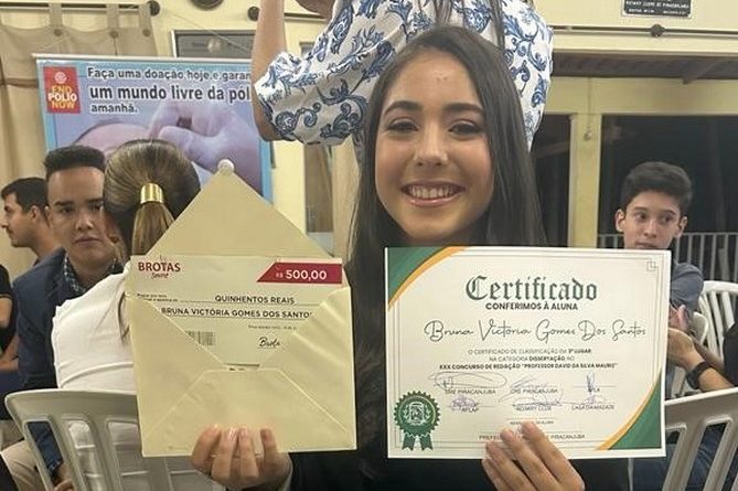 A estudante do 9º ano do ensino fundamental da Escola Municipal Crispim Marques Moreira, da região de Água Branca, em Silvânia, Bruna Victória Gomes dos Santos, de 15 anos, foi uma das premiadas no XXX Concurso de Redação Profº David da Silva Mauriz, organizado pela Secretaria Municipal de Educação de Piracanjuba.