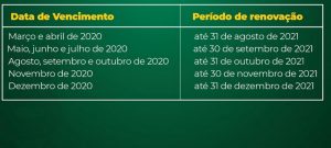 A Deliberação 232 do Contran, que entrou em vigor no dia 2 de agosto deste ano, estabeleceu um cronograma escalonado. Desta forma, os condutores com CNHs vencidas entre março e abril de 2020 têm até 31 de agosto de 2021 para revalidar o documento; CNHs vencidas entre maio e julho de 2020 deverão ser renovadas até 30 de setembro deste ano. Quem teve a CNH vencida em dezembro de 2020 poderá circular com o documento até dezembro deste ano (ver tabela abaixo).